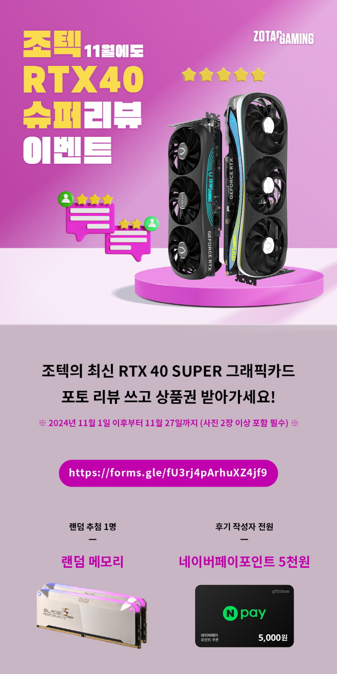 지포스 그래픽카드 전문 기업 조텍코리아(ZOTAC Korea, 대표이사 김성표)는 자사의 지포스 RTX 40 SUPER 시리즈 그래픽카드 구매자 대상으로 구매 후기 이벤트를 진행한다.