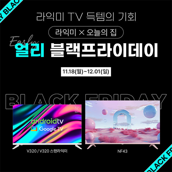 TV·모니터·냉장고·와인셀러 등 종합 가전 브랜드 라익미는 오늘의집이 시작한 연말 블랙프라이데이 할인행사에 라익미 NF43·V320·V320스탠라익미 등 1인 사용자에게 가장 선호도가 높은 32형~43형 스마트TV 3종이 참여한다고 밝혔다. 이 중 V320스탠라익미는 매력적인 무빙 스탠드와 결합한 32형 제품으로, 공간활용성은 물론 공간 스타일 연출에도 탁월해 더욱 눈길을 끌 것으로 예상된다.