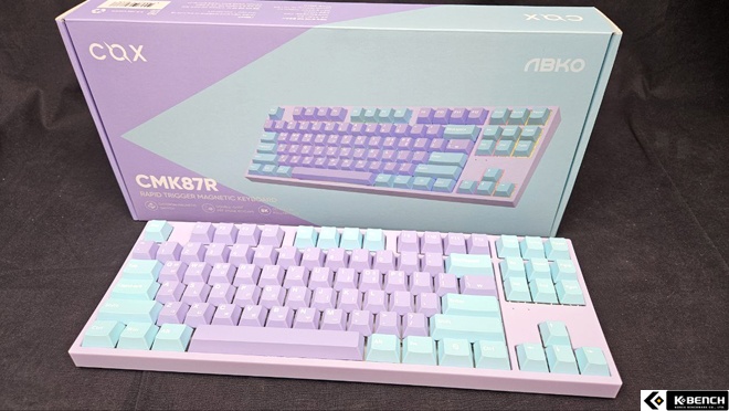 COX CMK87R 자석축 래피드 트리거의 색상은 보라색 계열을 기반으로한 투톤 컬러가 적용되어 있다. 주요 기능키에 시안 컬러가 적용되고