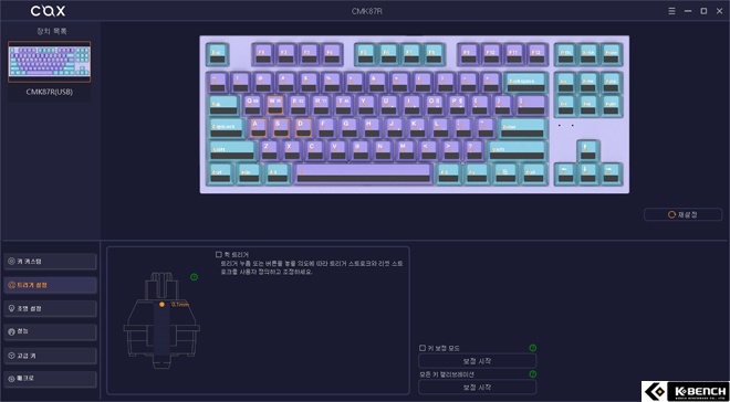 특히 이번 COX CMK87R 자석축 래피드 트리거의 래피드 트리거 셋팅은 소프트웨어로 조정이 가능하며 키보드의 모든 키를 0.1~