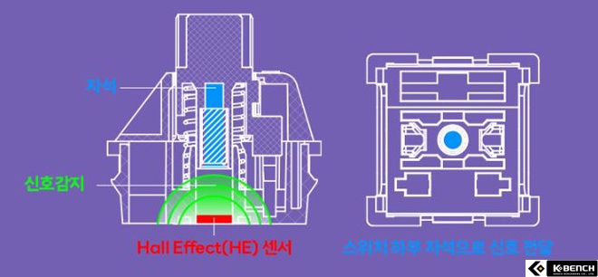 자석축의 원리는 스위치 내부에 제공되는 네오디뮴 자석이 위아래로 움직이면 이를 바닥에 있는 홀센서가 자기장을 감지해서 그 거리를 인식하는