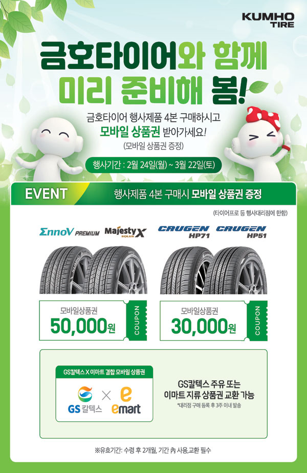 대상 제품은 금호타이어의 전기차 전용 타이어 이노뷔 프리미엄(EnnoV Premium)과 마제스티X(Majesty X) 솔루스, 크루젠(CRUGEN) HP71, 크루젠 HP51 등 이며 3월 22일까지 GS칼텍스X이마트 결합 모바일 상품권 증정과 함께 현장에서 QR 인증 후 구매 시 추가 할인도 받을 수 있다. 행사에 관한 자세한 사항은 금호타이어 공식 홈페이지(www.kumhotire.com)를 통해 확인할 수 있다.