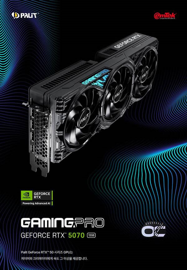 ㈜이엠텍아이엔씨(대표:이덕수)는 2025년 3월 6일, Palit Microsystems, Ltd (이하 Palit, 팔릿마이크로시스템즈) 의 NVIDIA 지포스 RTX 5070 시리즈 GPU를 탑재하는 그래픽 카드, Palit 지포스 RTX 5070 GAMINGPRO 시리즈를 출시한다고 밝혔다.