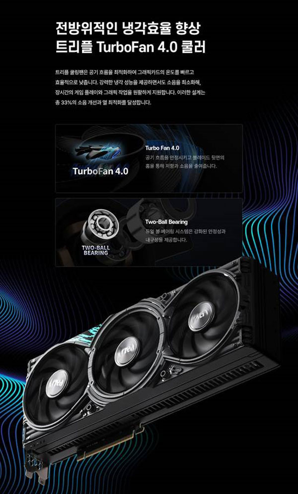 0-dB 기술 또한 적용. 게이머들에게 더욱 쾌적한 게임 플레이 환경을 제공한다. 그래픽카드 온도가 일정 온도 이하로 내려간 경우 쿨링팬이 회전을 멈춰 무소음 또는 저소음의 환경을 제공하게 되고, 일정 온도 이상에서 안정적인 작동을 위해 쿨링팬이 작동 된다.