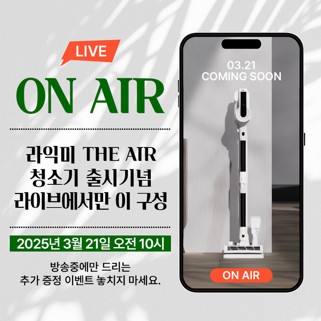 라익미 마케팅 담당자는 “편리한 청소가 가능하려면 무게가 가벼워야 하지만, 정작 가벼운 청소기는 흡입력이 만족스럽지 못한 것이 흠”이라며, “라익미의 THE AIR 프로젝트는 가볍지만 강력한 성능, 다양한 환경에 최적화할 수 있는 기능, 편리한 관리기능 등을 집약해 더욱 쉽고 편리하게 청소를 끝낼 수 있는 제품을 지향한다”고 설명했다. 아울러 그는 “쇼핑라이브를 통해 제품을 조금 더 면밀히 살펴보고 구매를 결정할 수 있어 라익미 THE AIR 프로젝트의 장점을 확인하는 방송이 될 것”이라 밝혔다.