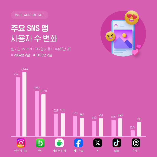 와이즈앱·리테일이 한국인 스마트폰 사용자(Android+iOS)를 표본 조사한 결과, 2025년 2월 한국인이 가장 많이 사용한 SNS 앱은 인스타그램으로 2,644만 명이었다. 그 뒤로 밴드 1,738만 명, 네이버 카페 952만 명, 페이스북 767만 명, X 751만 명, 틱톡 743만 명, 스레드 593만 명 순이었다.