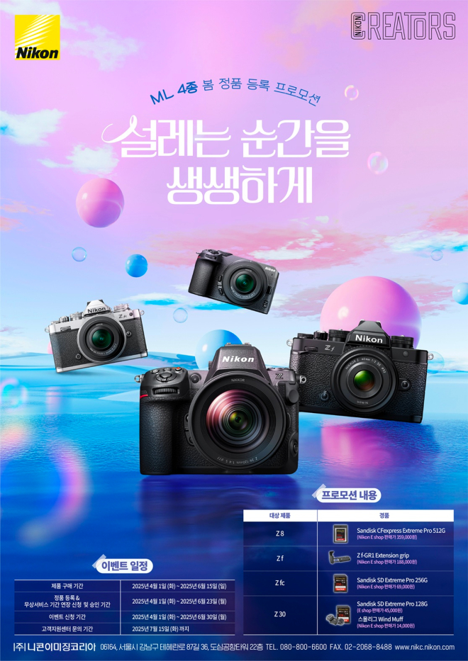 이번 행사는 Z8, Zf, Zfc, Z30의 니콘 인기 미러리스 4종과 NIKKOR Z 135mm f/1.8 S PLENA 등 NIKKOR Z 렌즈 14종을 대상으로 한다. 먼저, 미러리스 카메라 구매 고객에게는 각 제품에 맞춘 실용적인 경품이 제공된다. Z8 구매 시 Sandisk CFexpress Extreme Pro 512GB 메모리카드를, Zf 구매 시 전용 익스텐션 그립(Zf-GR1)을 받을 수 있다. 또한, Zfc 구매 고객은 Sandisk SD Extreme PRO 256GB 메모리 카드를, Z30 구매 고객에게는 Sandisk SD Extreme PRO 128GB 메모리 카드와 윈드머프를 함께 증정할 예정이다.