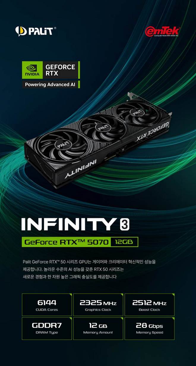 국내 PC 그래픽카드 점유율 1위이자, 대한민국 토종 그래픽카드 브랜드인 ㈜이엠텍아이엔씨(대표:서영식, 이하 이엠텍)은 2025년 4월 9일 Palit 지포스 RTX™ 5070 Infinity 3 D7 12GB 이엠텍을 출시한다고 밝혔다.