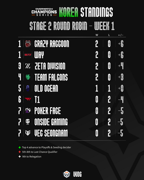 프레야의 활약과 올드 오션의 첫 승리로 화제를 모은 OWCS 코리아 스테이지 2의 1주 차는 무실세트 2연승으로 순조로운 출발을 알린 크레이지 라쿤과 올 게이머즈 글로벌이 공동 1위를 기록했으며, 스테이지 1에서 상위권을 기록한 제타 디비젼(Zeta Division), 팀 팔콘스(Team Falcons)가 세트 득실에서 차이를 보이면서 각각 3위와 4위를 기록했다.