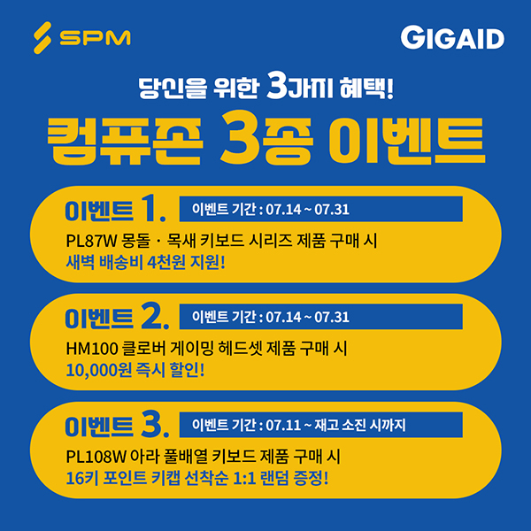이번 행사는 배송비 지원, 즉시 할인, 포인트 키캡 증정 등 제품별로 다양한 혜택이 마련되어 있으며, 7월 11일부터 순차적으로 진행된다. 행사 대상 제품은 SPM의 대표 키보드 시리즈인 PL87W 무선 키보드, PL108W 아라 풀배열 키보드, 그리고 HM100 클로버 게이밍 헤드셋이다.