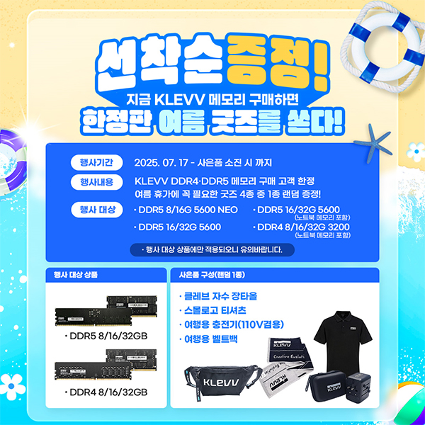에센코어 클레브의 공식 유통사인 파인인포가 여름 휴가철을 맞아 KLEVV(클레브) DDR4·DDR5 메모리 구매 고객을 대상으로 한정판 여름 굿즈 증정 프로모션을 7월 17일부터 진행한다 밝혔다.