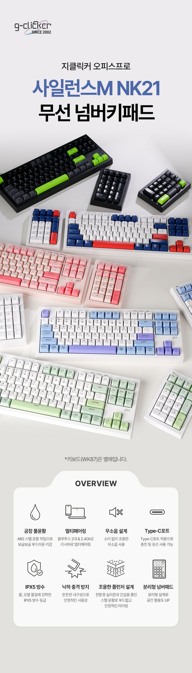 지클릭커 마케팅 담당자는 “텐키리스나 108키 배열의 불편을 일거에 해소할 수 있는 저렴하고 매력 넘치는 아이템으로 NK21을 추천하고 싶다”라며, ‘기존 키보드가 가진 불편을 모두 해소할 수 있는 기능성 아이템”이라 설명했다. 아울러 그는 “다양한 컬러, 매끄러운 키감과 무소음, 방수 기능 등으로 만족감이 더욱 클 것”이라며, “기존에 사용하던 어떤 키보드와도 매칭할 수 있어 더 효율 높은 작업 환경을 구축할 수 있을 것”이라 설명했다.