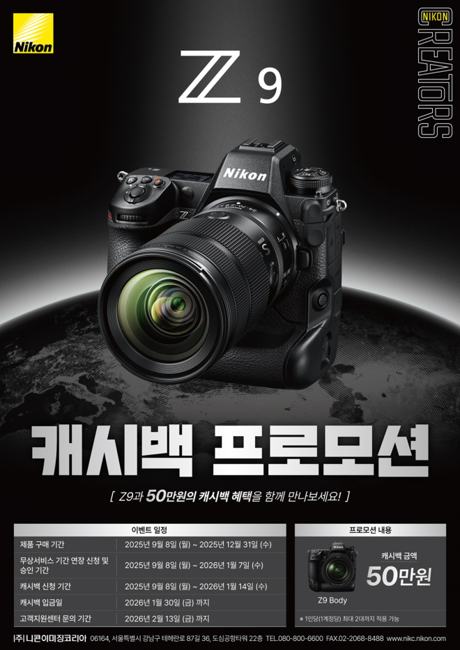 이번 이벤트는 Z9 구매 고객에게 총 50만원의 캐시백 혜택을 제공하는 방식이다. 오늘부터 12월 31일까지 Z9을 구입하고 내년 1월 7일까지 무상 서비스 기간 연장 신청을 마친 뒤, 같은 달 14일까지 이벤트를 신청하면 혜택을 받을 수 있다. 자세한 사항은 니콘이미징코리아 공식 홈페이지를 통해 확인 가능하며, 캐시백은 2026년 1월 30일 일괄 지급될 예정이다.
