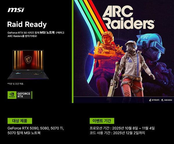 ㈜엠에스아이코리아( https://kr.msi.com , 대표 공번서)는 엔비디아 블랙웰(Blackwell) 아키텍처 기반 지포스 RTX 50 시리즈 랩톱 GPU를 탑재한 MSI 노트북 구매 고객을 대상으로 PvPvE 서바이벌 액션 게임 아크 레이더스(ARC Raiders) 스탠다드 에디션과 방랑자·아스트로 코스메틱 팩을 무료로 제공하는 번들 프로모션을 진행한다고 밝혔다.