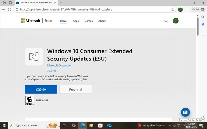 10 Consumer Extended Security Updates(ESU)"라는 제품 페이지를 게시한 것으로