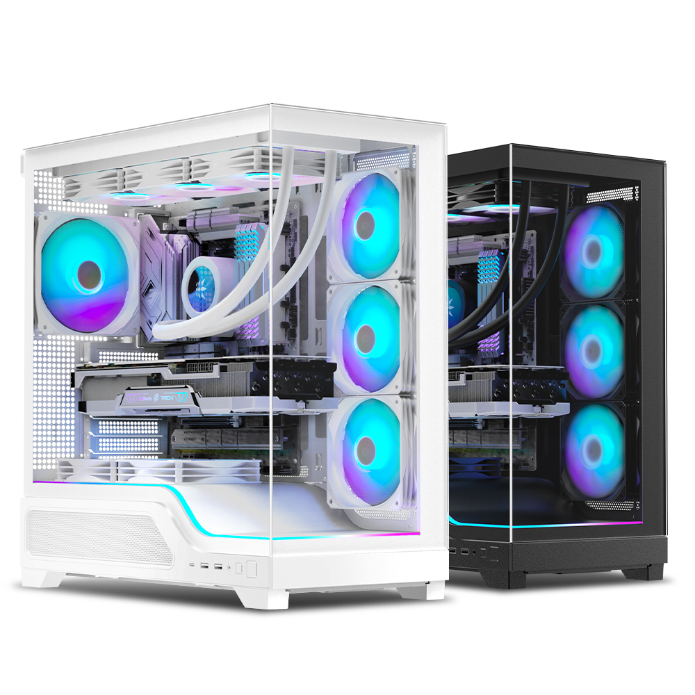 전면과 좌측면에는 강화유리를 적용하여 내부를 넓게 드러내는 풀 파노라믹 디스플레이를 구현했으며, 기본 구성으로 제공되는 HDB 쿨링팬 4개(측면 120mm 3개, 후면 140mm 1개)는 화려한 조명 효과와 함께 안정적인 쿨링 성능을 제공한다.