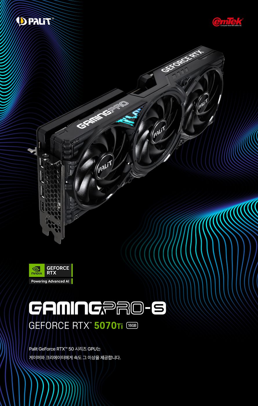이번 이벤트 대상 제품 중 하나인 Palit 지포스 RTX™ 5070 Ti GAMINGPRO-S D7 16GB 이엠텍은 초고속 GDDR7 메모리와 향상된 RT 코어 및 5세대 Tensor 코어가 탑재된 최신형 그래픽 카드로 CUDA Cores 8,960개, Boost Clock 2,452MHz를 제공하여 게이머와 크리에이터를 위한 최적의 성능을 제공한다.