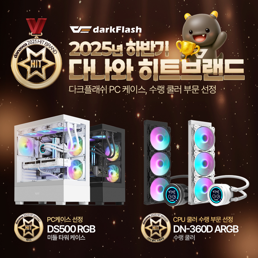 글로벌 컴퓨터 주변기기 브랜드 다크플래쉬(darkFlash)의 공식 수입사 ㈜투웨이(대표이사 한지강)는 PC 케이스 ‘darkFlash DS500 RGB’와 CPU 수랭쿨러 ‘darkFlash NEBULA DN-360D’가 ‘2025년 하반기 다나와 히트브랜드’에 선정됐다고 밝혔다.