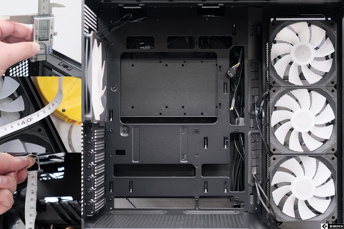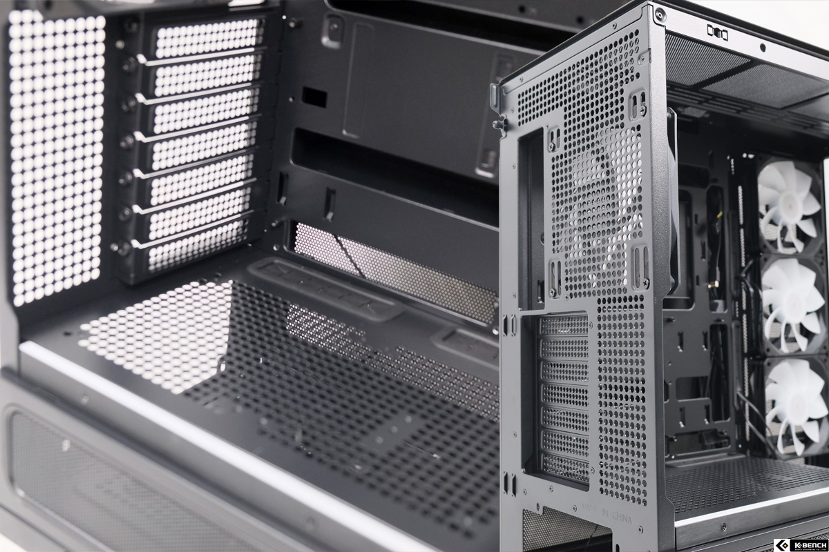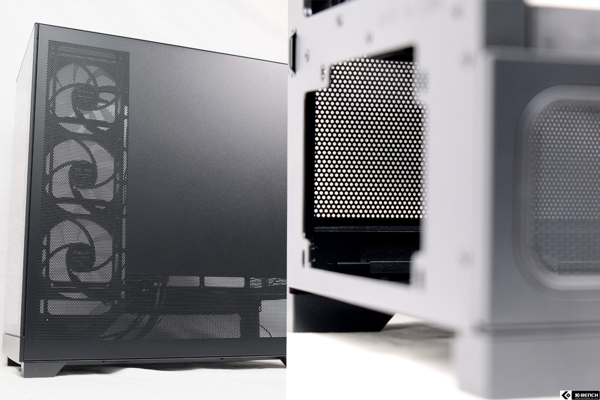 배치되는 팬 구성이다. 특히 측면은 L자형 메쉬 패널을 그대로 활용해 기본 제공되는 120mm 팬 3개가 장착된 상태로 출고되며, 이 영역이