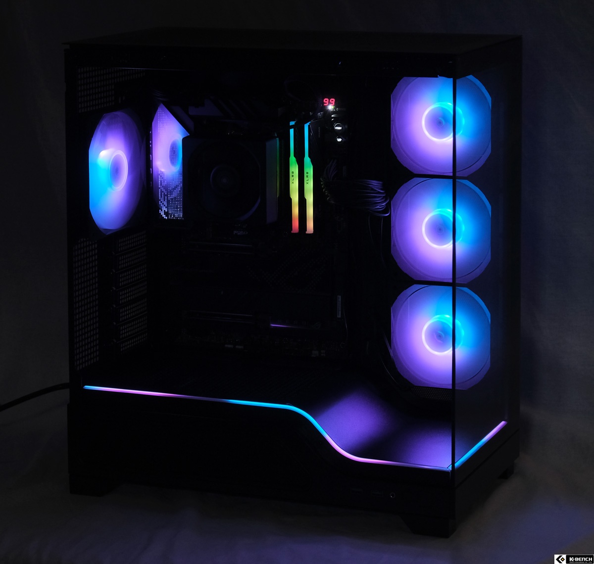 장착된 aRGB 팬은 측면 흡기 구역과 후면 배기 위치에서 빛을 발하며, 어항형 구조의 개방된 시야를 통해 조명 연출이 내부 전체에 자연스럽게