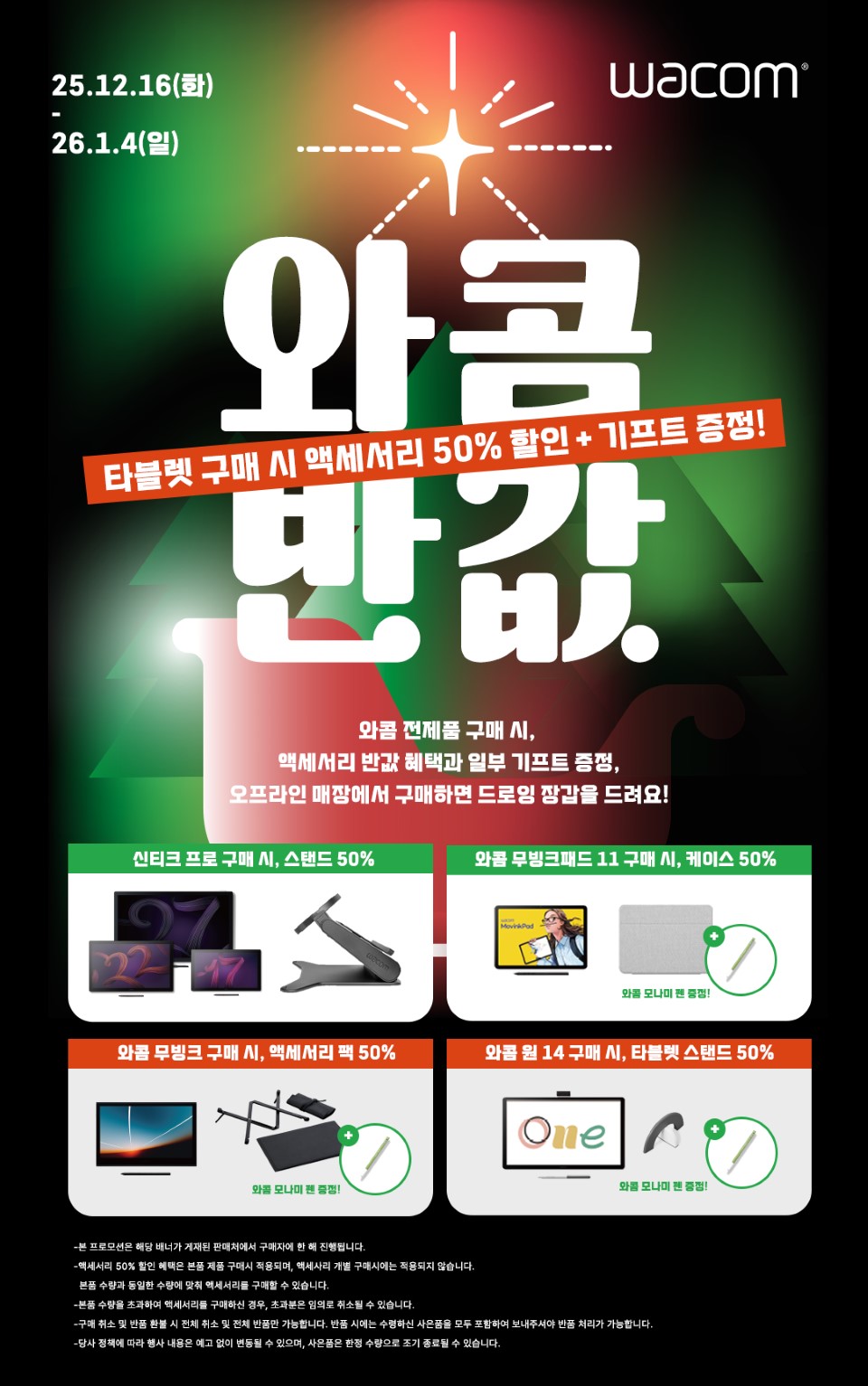 세계적인 타블렛 전문 기업 와콤(Wacom)의 한국법인 와콤코리아(대표 이데 노부타카, www.wacom.com)가 연말을 맞아 금일부터 오는 1월 4일(일)까지 전 제품군을 대상으로 다양한 혜택을 제공하는 ‘와콤 홀리데이 프로모션’을 진행한다.