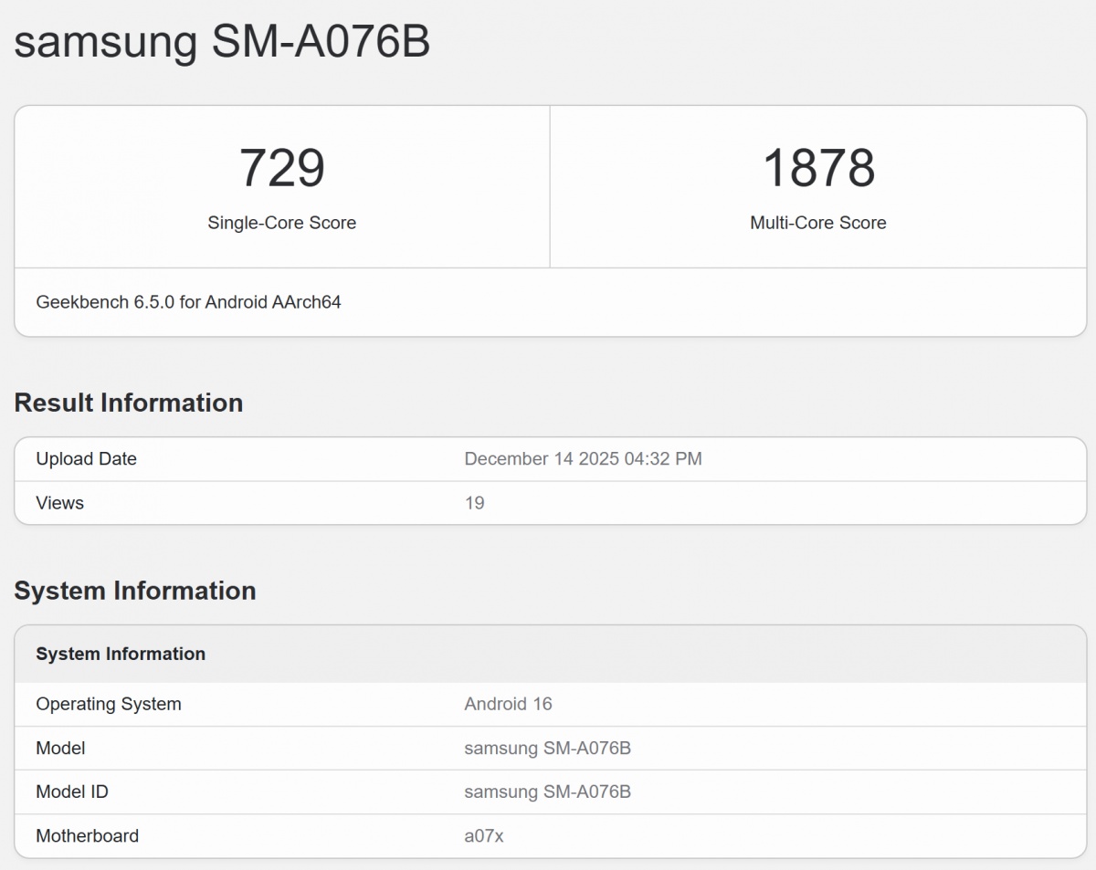 삼성전자 보급형 5G 스마트폰 ‘갤럭시 A07 5G’가 긱벤치 데이터베이스에서