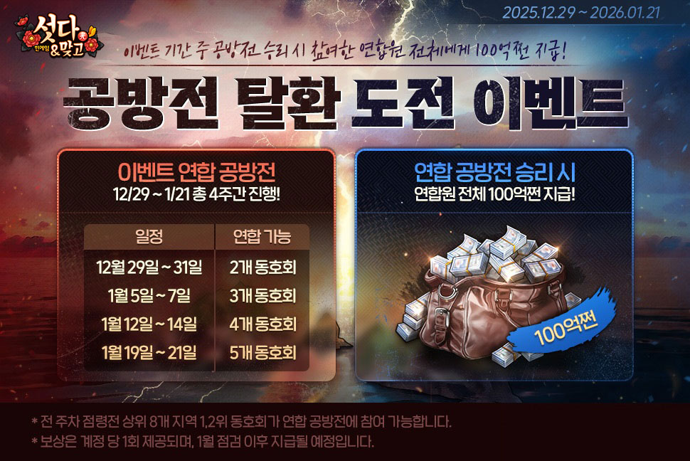 축제 열기는 1월에도 이어진다. 12월 29일부터 내년 1월 21일까지 총 4주간 ‘연합 공방전 탈환 도전 이벤트’가 열린다. 기간 내 진행되는 4회의 공방전에서 승리한 연합원 전원에게는 100억 쩐의 보상이 지급된다. 특히 12월 30일 진행되는 공방전에는 ‘응원 이벤트’가 더해져, 응원 참여자 중 추첨을 통해 삥아리 패키지, 벅스 6개월 이용권, 최대 10억 쩐 등 현물과 게임 아이템을 아우르는 푸짐한 선물을 증정한다.