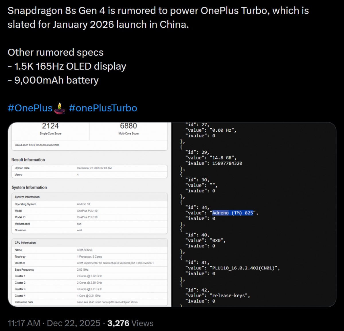 터보(OnePlus Turbo)’가 벤치마크 데이터베이스를 통해 윤곽을 드러냈다.
