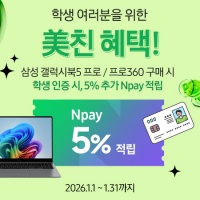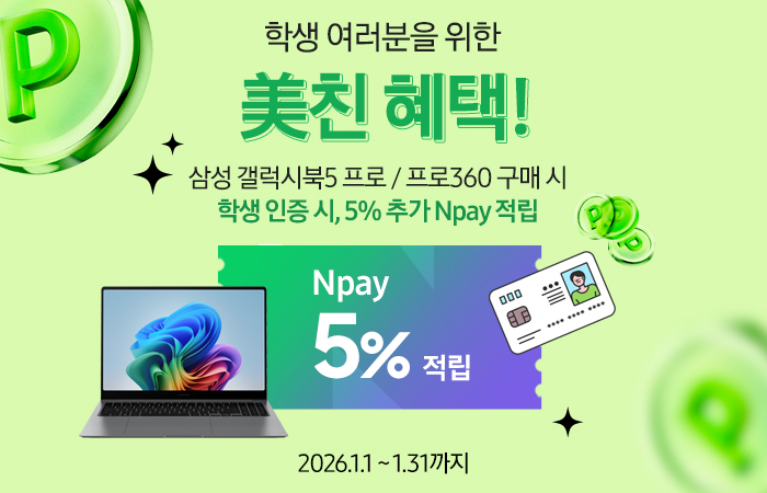 삼성전자 공식파트너사 유니씨앤씨는 네이버 스마트스토어에서 '삼성 스튜던트 페이백' 이벤트를 진행한다. 갤럭시북5 프로 시리즈를 구매하는 학생 고객 대상으로 카드사 간편결제 시 7% 할인과 네이버페이 5% 추가 적립 혜택을 제공하는 이번 프로모션은 2026년 1월 1일부터 31일까지 한 달간 진행된다.