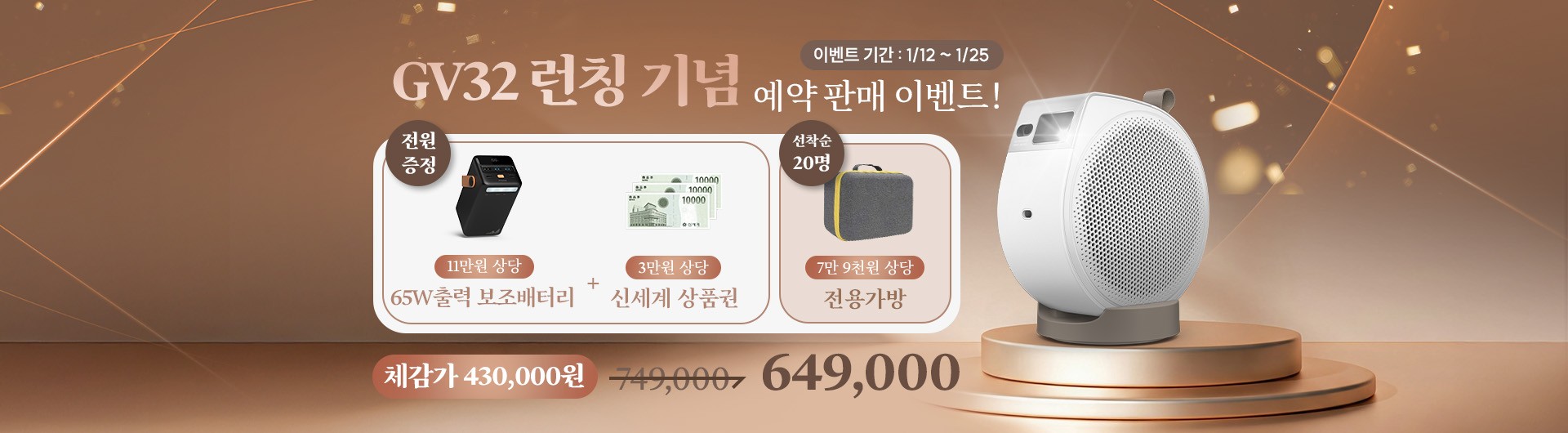 벤큐는 GV32 출시를 기념해 1월 12일부터 1월 25일까지 런칭 예약판매 혜택을 제공한다. 예약판매 기간 동안 GV32는 정가 749,000원에서 649,000원으로 구매할 수 있으며, 구매 고객 전원에게 11만원 상당 65W 출력 보조배터리와 3만원 상당 신세계 상품권을 증정한다. 또한 선착순 20명에게는 7만 9천원 상당 전용가방을 추가로 제공해, 혜택을 합산할 경우 43만원대의 체감가로 제품을 구매할 수 있는 셈이다.