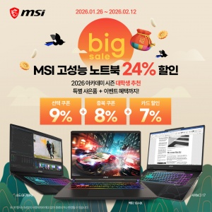 엠에스아이코리아(대표 공번서)는 오는 1월 26일(월)부터 2월 12일(목)까지 진행되는 G마켓 '설 빅세일'에 참여해, MSI 노트북 전 제품을 대상으로 제품별 최대 24% 할인 혜택을 제공하는 프로모션을 선보인다.