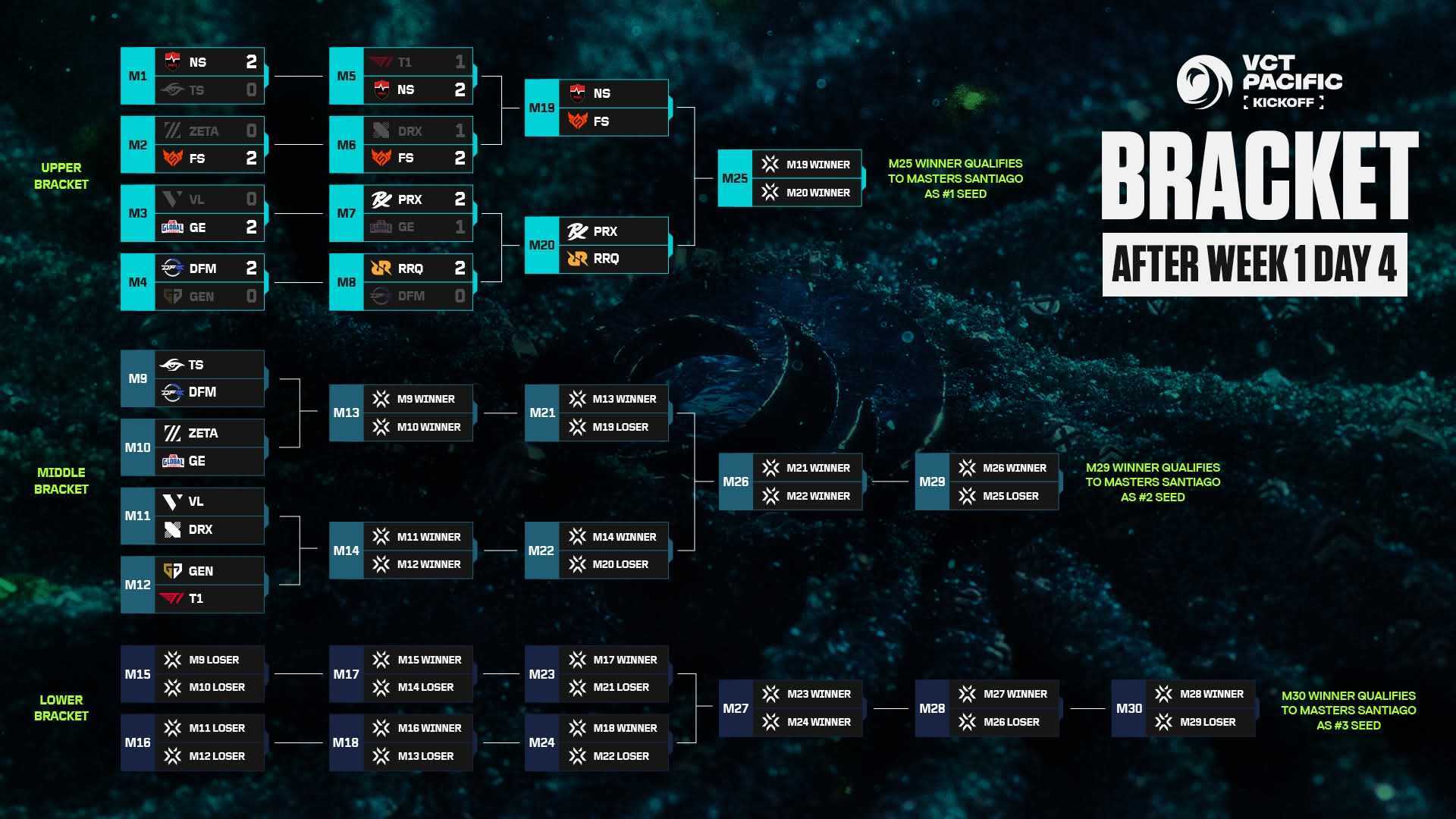 개막주 결과에 따라 상위조 4강 대진은 농심 레드포스와 풀 센스, 페이퍼 렉스와 렉스 리검 퀀으로 결정됐다. 파란을 일으킨 하위권 팀들 간 맞대결과 전통 강호들의 수성전이 준결승에서 펼쳐지며 마스터스 산티아고행 티켓을 향한 경쟁은 더욱 가열될 전망이다.