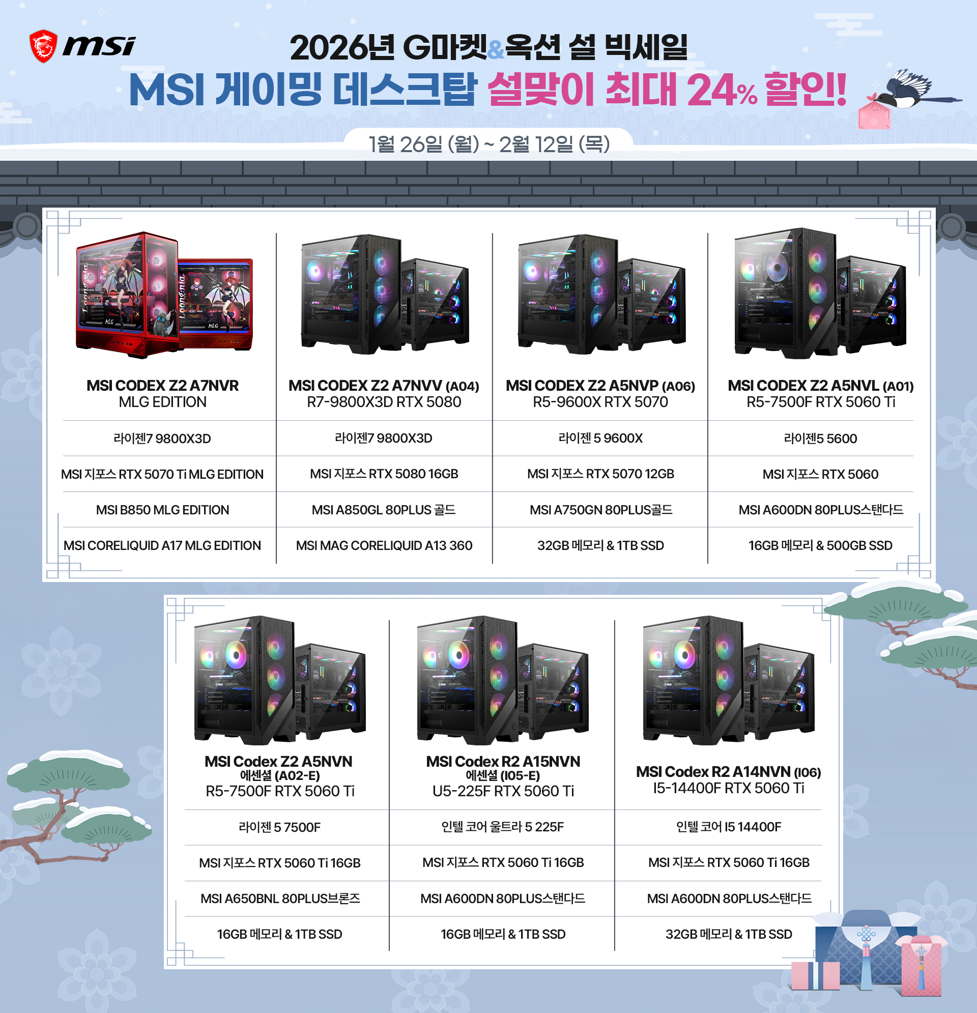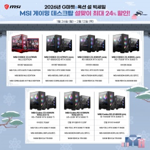㈜엠에스아이코리아(대표 공번서)는 1월 26(월)부터 2월 12일(목)까지 진행되는 G마켓&옥션 ‘설 빅세일’을 통해, 강력한 성능의 게이밍 데스크탑 ‘Codex(코덱스)’ 시리즈를 상반기 최대 혜택가로 판매한다.