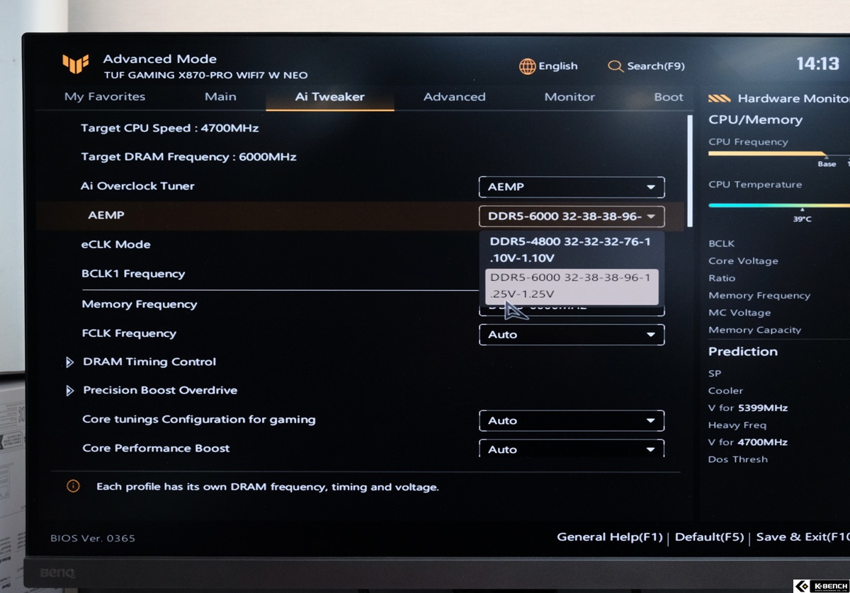 메모리는 ASUS의 AEMP 기능을 활용해 손쉽게 DDR5 6000으로 오버클럭했다. 복잡한 수동 설정 없이 자동 최적화만으로 세팅이 완료됐고,