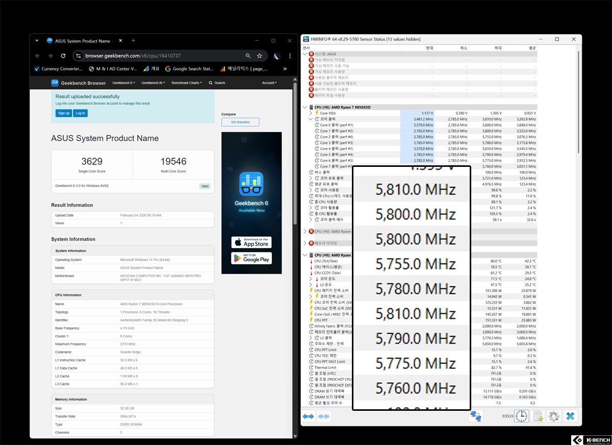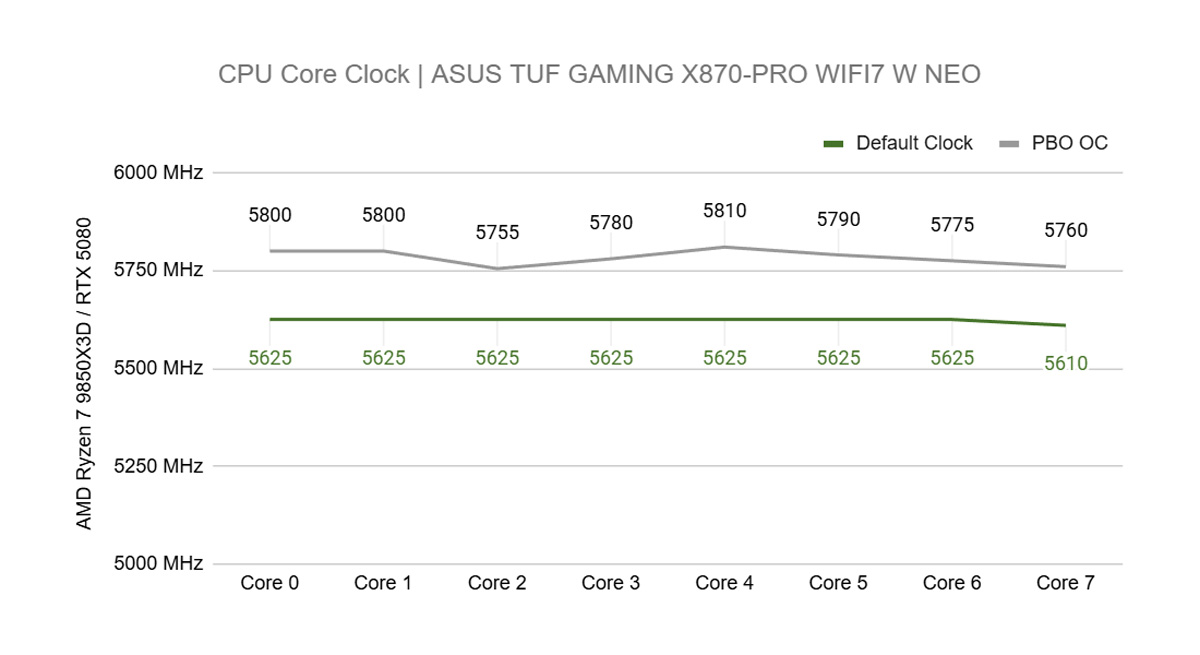 오버클럭이 아닌 PBO 기반 오버클럭을 적용했으며, 기본 상태에서 최고 부스트 클럭이 약 5.6GHz 수준이던 것을 5.8GHz까지 안정적으로