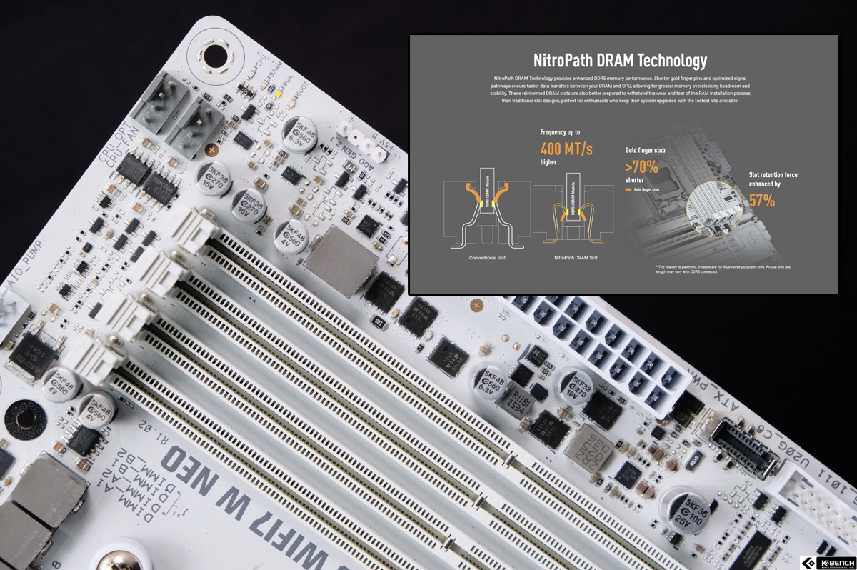 ASUS의 NitroPath DRAM Technology가 적용된 DDR5 메모리 소켓이 사용됐다. 기존 슬롯 대비 신호 경로를 단순화하고 접점