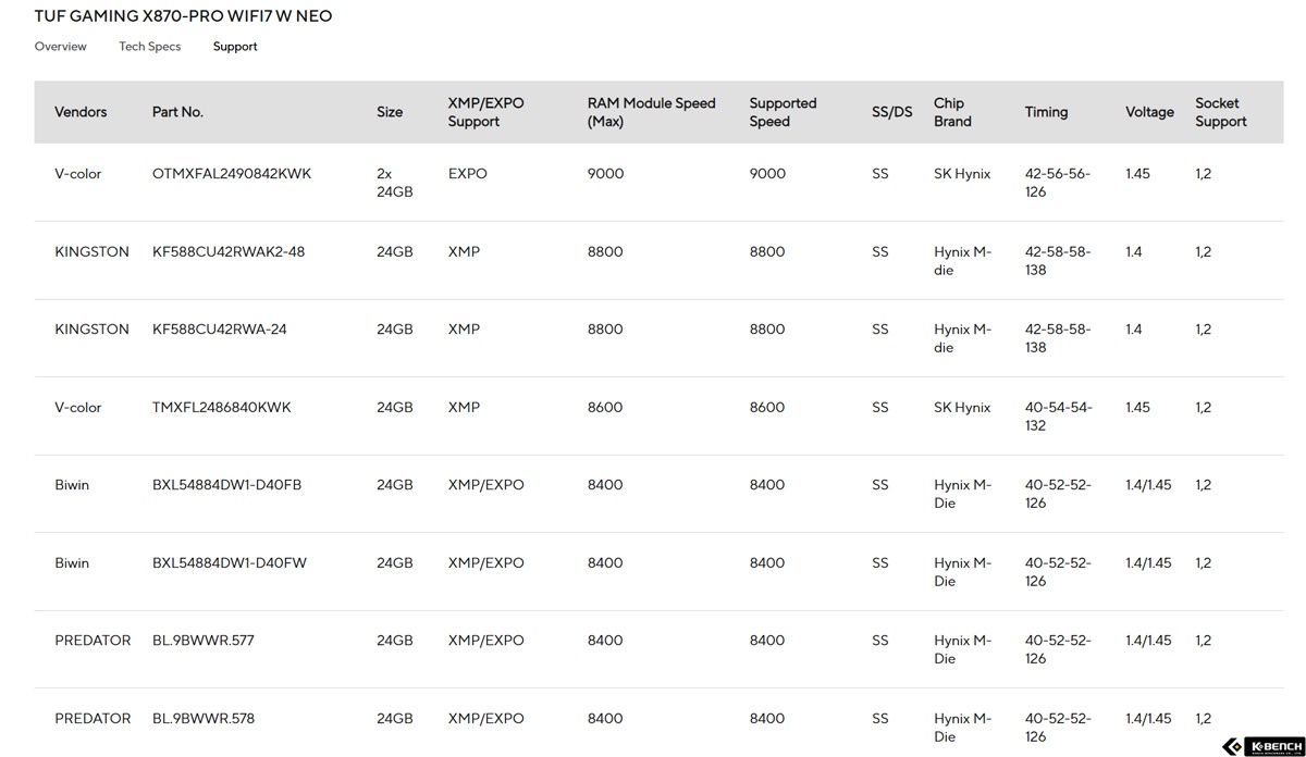 공식 스펙으로도 DDR5 9600MHz 이상(OC)까지 대응한다고 밝히고 있는데, 이미 ASUS가 등록한 메모리 QVL(검증 메모리