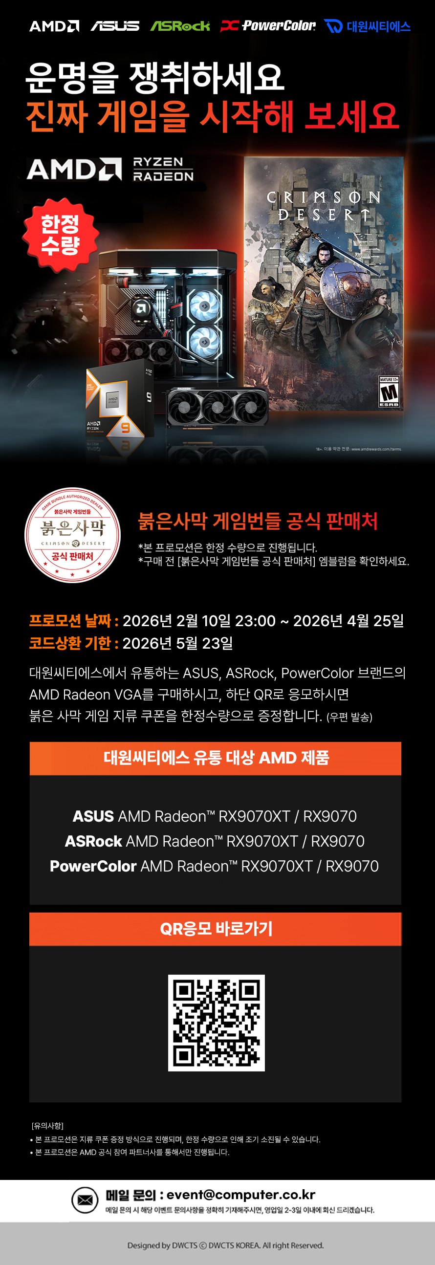 이번 프로모션은 2026년 2월 10일부터 4월 25일까지 진행되며, 기간 내 대상 AMD 제품을 구매한 고객은 오는 3월 19일부터 출시 예정인 ‘붉은 사막’ 게임 코드를 증정받을 수 있다.