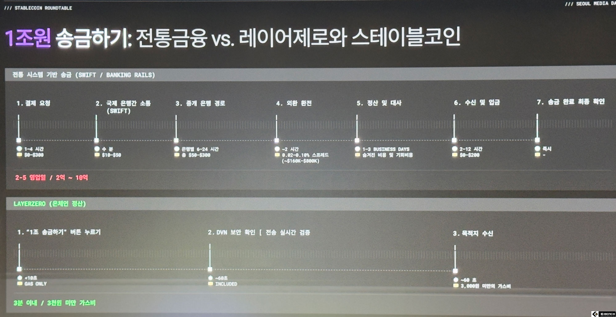 경제적 측면에서의 비교 수치도 제시됐다. 임 총괄은 "전통 금융 망을 통해 1조 원을 해외 송금할 경우 2~5일의 시간과 약 10억 원의