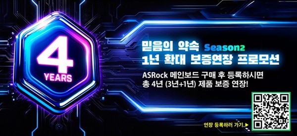 ‘4년 보증연장 프로모션 시즌2’는 2024년 9월 1일부터 2026년 3월 31일까지, 국내 정식 경로를 통해 유통된 애즈락 메인보드 구매자만 참여할 수 있다. 행사 기간 내 메인보드를 구매한 고객은 애즈락 공식 이벤트 사이트에 제품을 등록하면 기본 3년 보증에 1년을 추가한 4년의 품질 보증 기간을 적용 받는다.