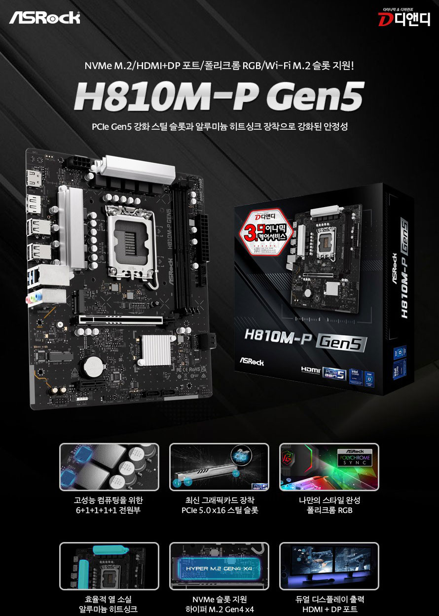 3년 다이나믹케어 서비스를 앞세워 혁신적인 IT 하드웨어 솔루션을 제공하는 디앤디컴(대표: 손권석, 이하 디앤디)에서 최신 인텔 플랫폼 기반의 메인스트림 메인보드 '애즈락 H810M-P Gen5'를 출시했다고 밝혔다.