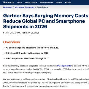 가트너는 2월 26일 공개한 보고서를 통해 메모리(DRAM·NAND) 가격 급등이