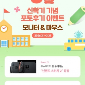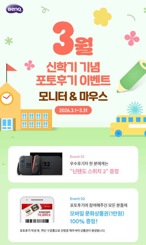 신학기와 함께 새로운 목표를 시작하는 학생과 직장인들을 응원하기 위해 마련된 이번 이벤트는 3월 한 달 간 벤큐 모니터 또는 마우스를 구입하고 포토후기를 작성한 뒤, 구글폼으로 신청한 모든 분들에게 모바일 문화상품권(1만원권)을 증정하고, 우수 후기자 한 명에게는 닌텐도 스위치 2’를 추가로 증정하는 행사이다.