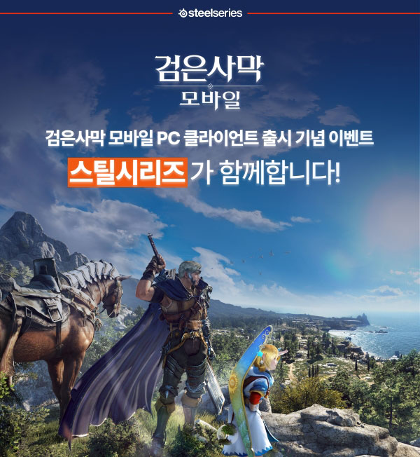 스틸시리즈는 검은사막 모바일 PC 클라이언트 출시 기념 이벤트에 아크티스 노바 5 (Arctis Nova 5) 무선 게이밍 헤드셋과 프라임(Prime) 유선 게이밍 마우스를 경품으로 제공한다.
