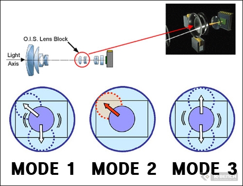 <MODE 1>은 카메라의 움직임을 지속적으로 감지하여 O.I.S 렌즈를 같이 움직여준다.
