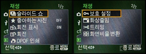 재생 메뉴에서는 촬영된 사진의 설정이 가능하다. 회전이나