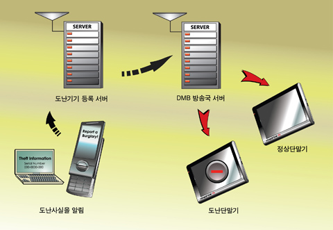 망을 활용한 것으로 DMB수신 기능을 갖는 모든 디지털 기기에 적용할 수 있으며 도난 된 기기가 작동 될 경우 도난기기로 해당 신호를 보내 기기