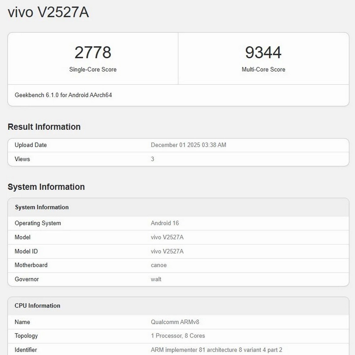 모델 ‘비보 S26 프로 미니(V2527A)’가 벤치마크 플랫폼 긱벤치(Geekbench)에 등장했다.